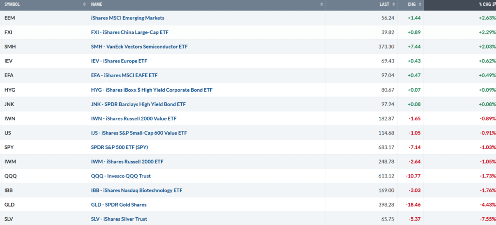 Emerging Markets, China, and Semiconductors led thanks to Friday’s strength, while Gold and Silver were under selling pressure.