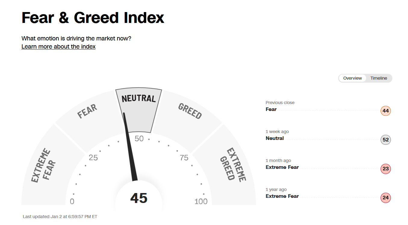 Investor sentiment, as measured by the Fear and Greed Index (a contrarian indicator), closed at 45, a neutral reading. If sentiment rises to Extreme Greed, the risk of a short-term pullback will increase.