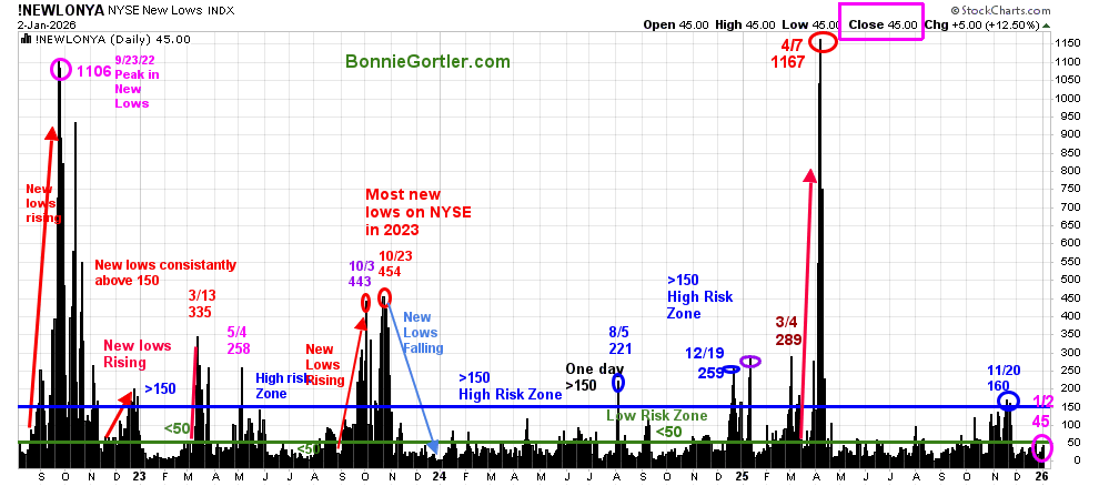 New Lows closed Friday, 1/2/26, at 45, in a low-risk zone, where prices tend to rise. It will remain positive in the short term if New Lows stay between 25 and 50. On the other hand, if new lows begin to increase and exceed 150, it would be short-term negative with more volatility and increased risk expected.
