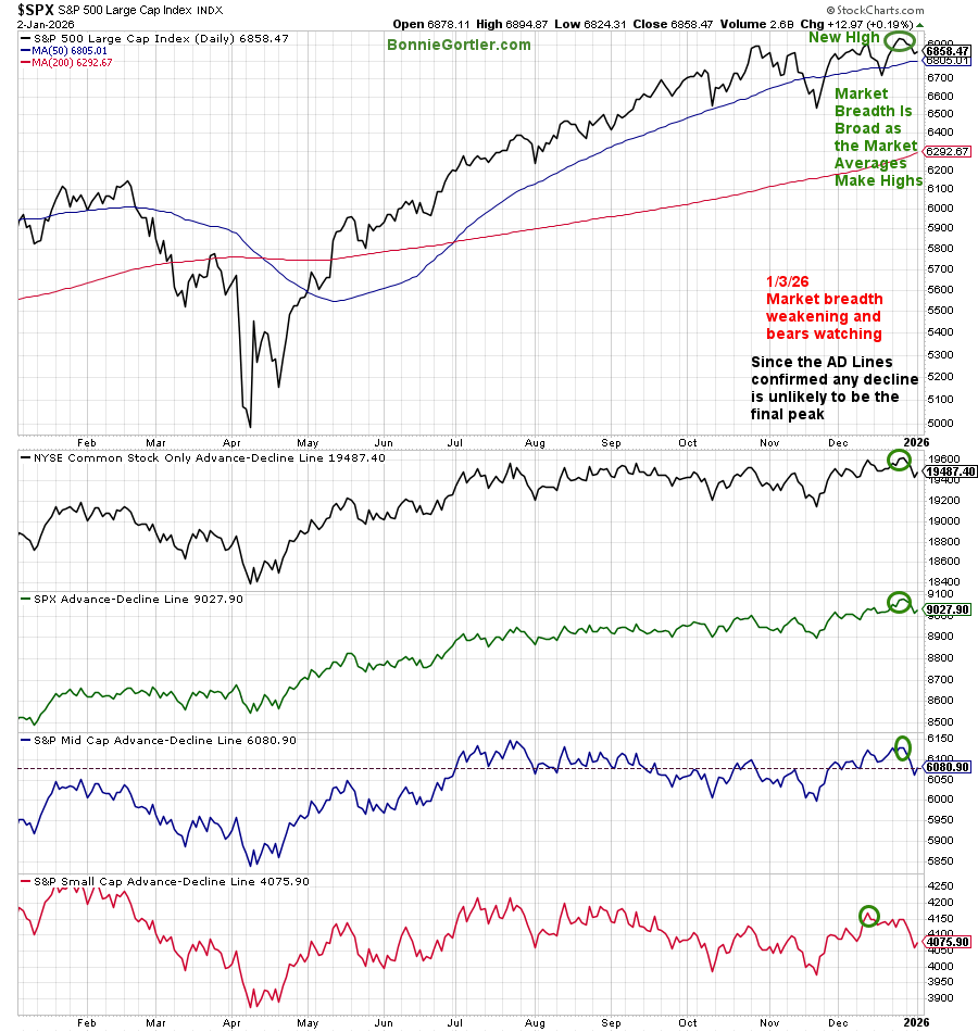 The last week of 2025 saw market breadth weaken, and bears watching. Market breadth, as measured by the Advances-Declines line, had confirmed the market averages’ new highs in 2025, implying that any decline is unlikely to be the final peak.