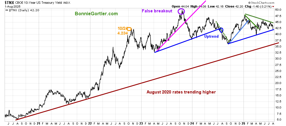 The 10-year U.S. Treasury dropped last week, closing at 4.220, as investors sold equities and bought Treasuries. If selling continues, its likely yields will decline further and break the August 2024 uptrend (blue line).