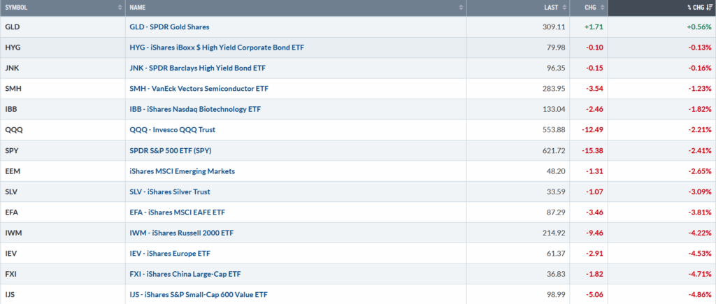 Gold eked out a slight gain thanks to Friday’s rise. International markets were weak, including China, Europe, and Emerging Markets. Small Cap Growth and Small Cap Value were under heavy selling pressure, much weaker than the S&P 500.