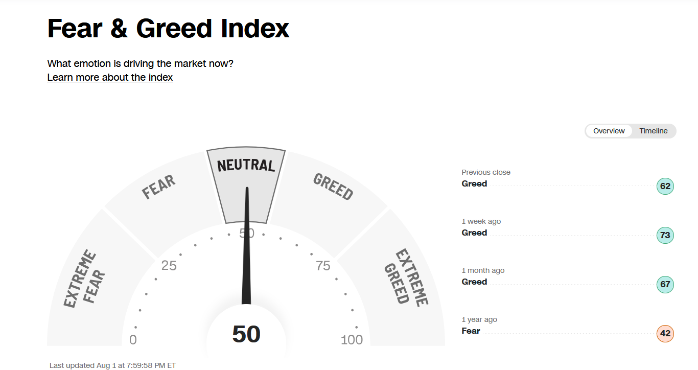 Investor sentiment, as measured by the Fear and Greed Index (a contrarian indicator), fell sharply to 50 last week, indicating a shift to Neutral and no longer showing Greed.