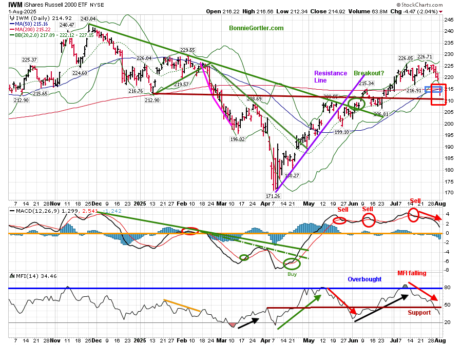 IWM short-term closed slightly above 214.00 with a low at 212.34 on Friday. Two closes below 214.00 would imply that the breakout failed and likely indicate continued weakness in the short term. Resistance is at 221.00 and 226.00.