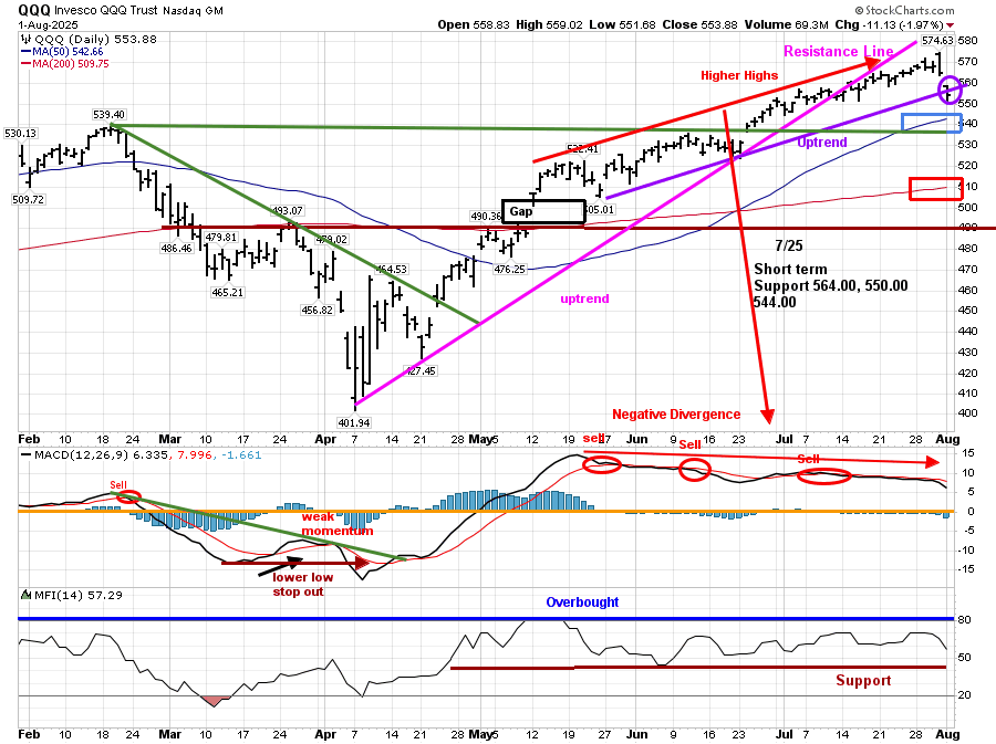 Nasdaq 100 (QQQ) fell -2.21% last week, breaking the May uptrend ( purple line) and support at 564.00 as mentioned in the 7/25 market update. However, its positive QQQ remains above the 50-day MA (blue rectangle) and the 200-day MA (red rectangle), and the April uptrend remains in effect.