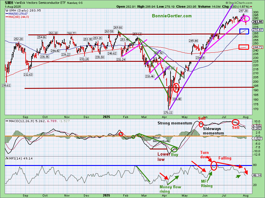 SMH can be highly volatile. If there is leadership in Semiconductors (SMH), it would have a short-term positive impact. On the other hand, if SMH is weak and closes below 282.00, a pullback is likely to trigger stops and profit-taking.