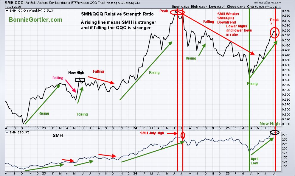 The top part of the chart is the weekly VanEck Vectors Semiconductor/Invesco QQQ Trust (SMH/QQQ) Index Ratio. A rising line indicates the SMH is stronger, and if falling, the QQQ is stronger.