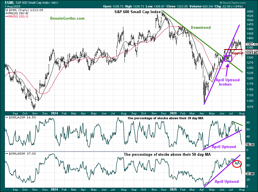 The S&P 600 Small Cap Index (top chart) broke key support at 1352.00 (brown line) for the second day on Friday, indicating a short-term negative trend.
