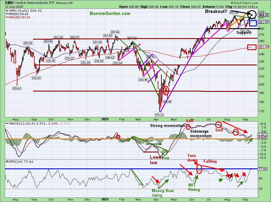 After a tight consolidation for several weeks, SMH rose by +3.76% last week, made a new high, after breaking the August downtrend (green line), indicating a potential breakout. SMH remains above both the rising 50-day MA (blue rectangle) and the    200-day MA (red rectangle).