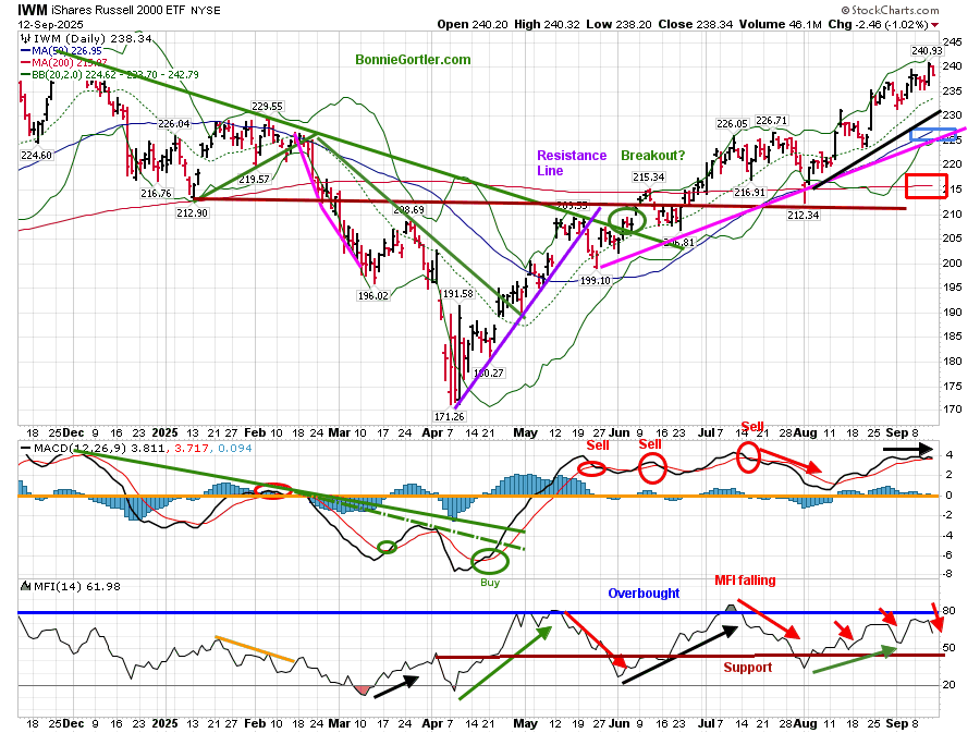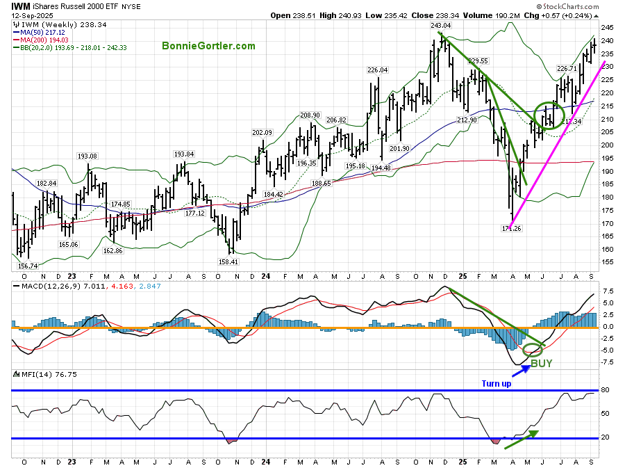 The Money Flow (lower chart) reached 80 earlier in May and July, indicating an overbought condition; however, it did not reach 80 in August, and has turned down. If interest rates continue to fall, IWM is likely to continue rising.