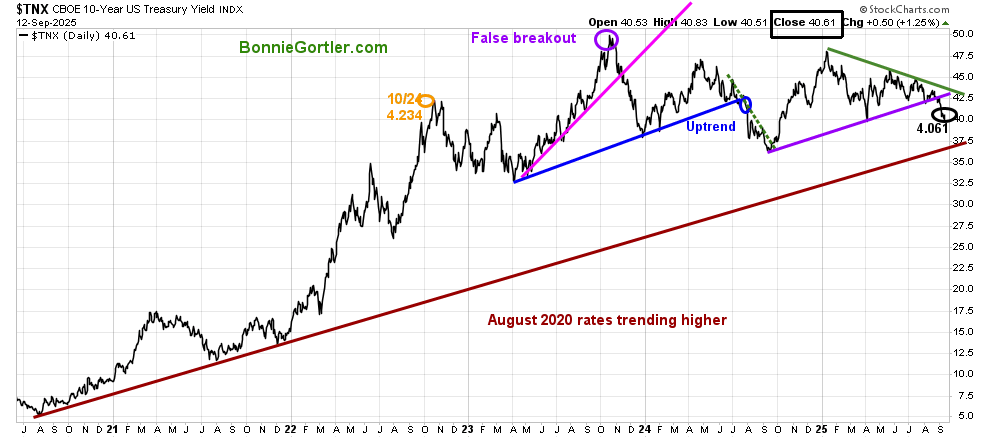 The 10-year U.S. Treasury Yield continues to fall, closing at 4.061, breaking the August 2024 uptrend (purple line), supporting gains in U.S. equities.