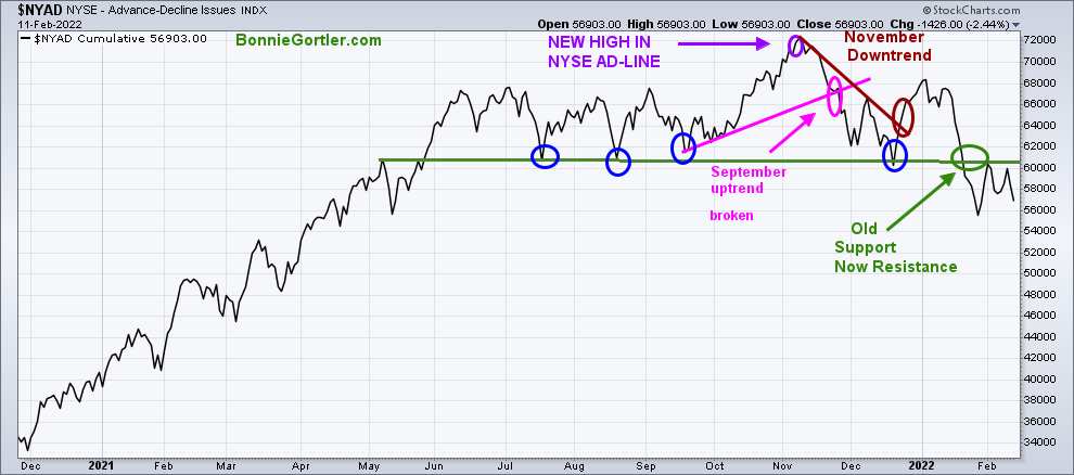 The NYSE A/D line made a new high on 11/8/21. In December, the AD line broke the November downtrend (brown line) but did not make a new high warning of a pending correction forthcoming in the NYSE. The lows made in July, August, September, and December (blue circles) did not hold and broke down in January (green circle).