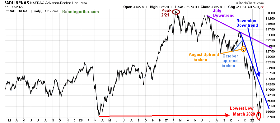The daily Nasdaq AD-Line peaked in February 2021 (brown circle), followed by failed attempts to make a new high.