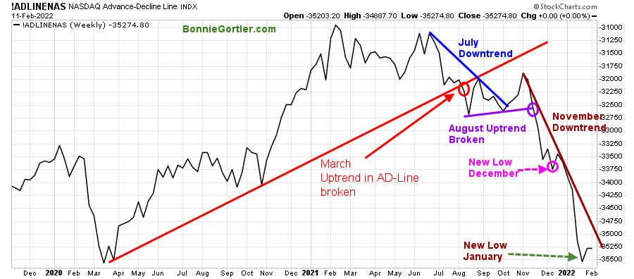 After breaking down in August last year, the Nasdaq-line Weekly AD-Line made a few attempts to form a bottom but failed.