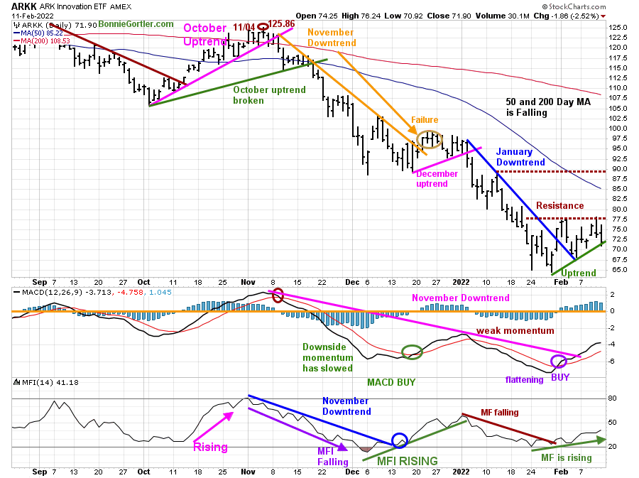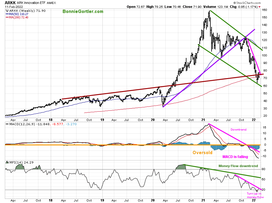 ARKK rallied early in the week but stalled at resistance and turned down, falling -1.17%, closing at 71.90, down less than the S&P 500 and Nasdaq.