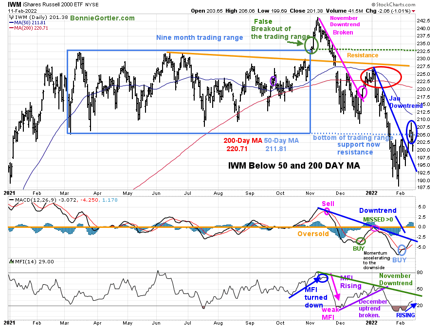 The top portion of the chart is the daily iShares Russell 2000 Index ETF (IWM), the benchmark for small-cap stocks, with a 50-Day Moving Average (MA) (blue line) and 200-Day Moving Average (MA), that traders watch and use to define trends. A false breakout occurred in November 2021 in IWM after being in a nine-month trading range.
