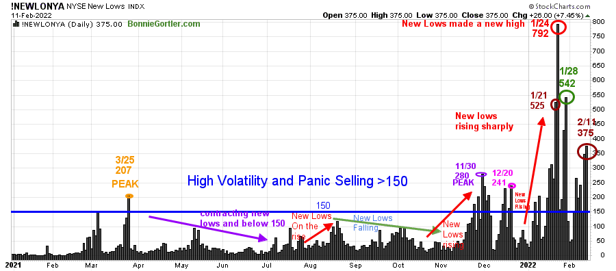 New lows warned of a potential sharp pullback, high volatility, and “panic selling” for most of 2022, closing above 150. Learn more about the significance of New Lows in my book, Journey to Wealth, published on Amazon. Here is an excerpt, When new lows are above 150, the market is negative, higher risk, selling is taking place. Sometimes it could be severe, and sometimes on a very nasty day, you can have “panic selling,” and big wild swings (high volatility) to the downside may occur.