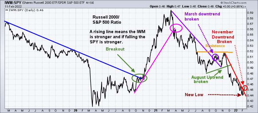It’s positive for the overall market that the IWM/SPY ratio turned up last week, breaking the November downtrend, and is now leading in relative strength compared to the S&P 500.