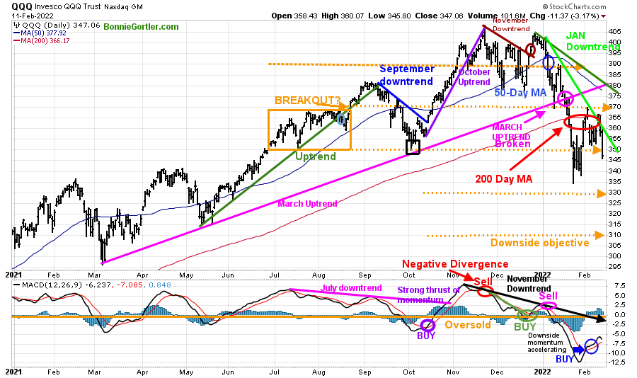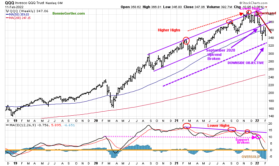 The top chart shows the weekly Invesco QQQ Trust (QQQ) making higher highs peaking in November 2021 (red circles) but failed to make a new high in December and then turned down.