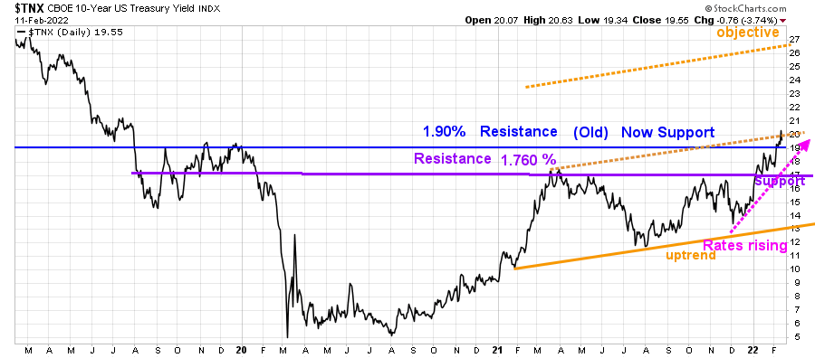 Small Caps rebounded. Technology and Semiconductors weakened, and Hi-Yield bonds continued to slide, which is troubling. 10-Year U.S. Treasury yields rose over 2% intra-week, for the first time since 2019, closing at 1.955% (Figure 3). The upside channel objective is 2.7%.