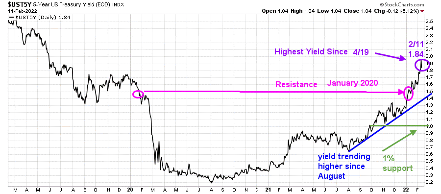 5-Year U.S. Treasury yields rose to 1.84%, the highest level since May 2019 ( purple circle), continuing to make higher highs.