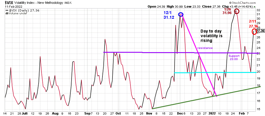 Volatility quieted early last week. However, volatility picked up as stocks weakened. VIX closing at 27.36 (red circle) above support at 23.00 but below the 1/26 high.