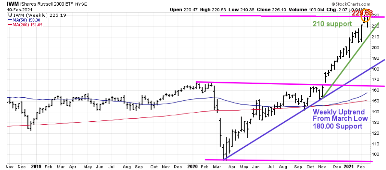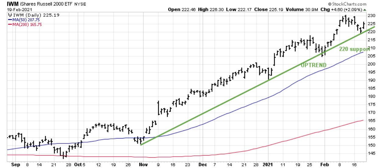 Until IWM closes below the uptrend line for two days, selling is likely to be contained.  If IWM breaks the uptrend, the next support is at the 50-Day MA at 207.75 (02/19/21).
